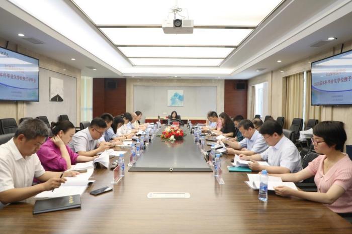 张海涛校长强调,学士学位授予是对本科毕业生大学四年学习生涯总体收获的检验,关系到学生的未来发展,要充分认识学士学位审核工作的重要性,确保学士学位评定客观、准确。相关部门与二级学院要充分发挥学士学位授予工作的导向和激励作用,不断加强教学管理,进一步提高教学质量,深入落实立德树人根本任务,扎实推进学校内涵式高质量发展。