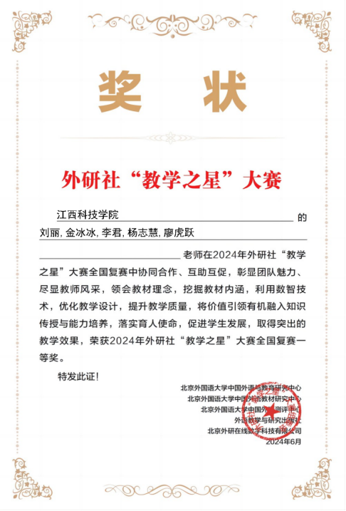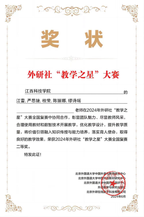 近日,在2024年外研社“教学之星”大赛全国复赛中,我校外国语学院通过创新的教学设计和先进的数智融合课堂,分别由刘丽、金冰冰、李君、杨志慧、廖虎跃组成的教学团队荣获全国英语类专业组复赛一等奖;江蕾、严思婕、桂莹、陈丽娜、缪诗瑶荣获全国大学英语组复赛二等奖。
