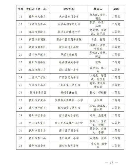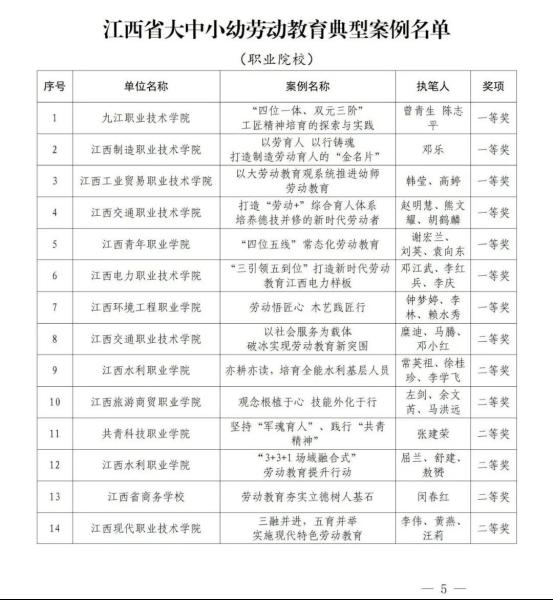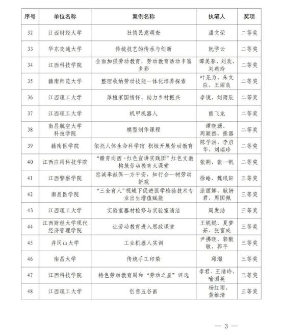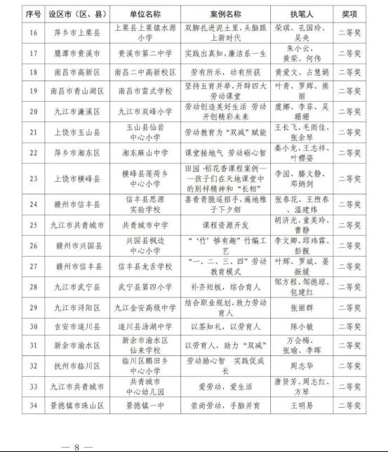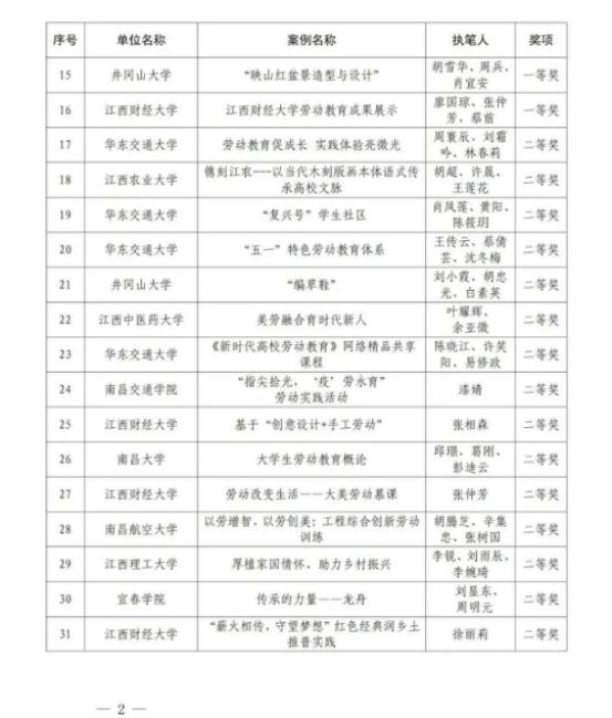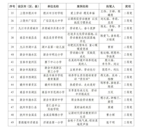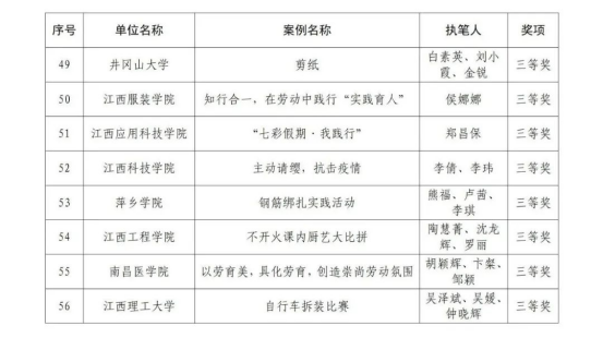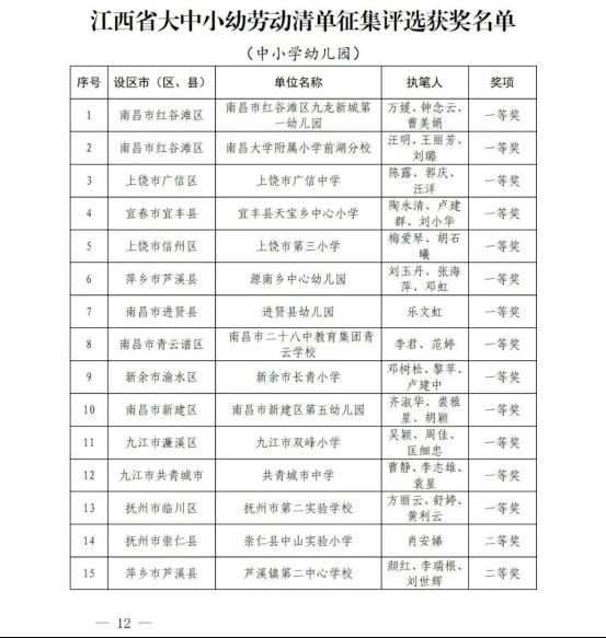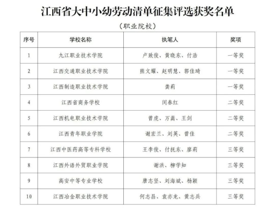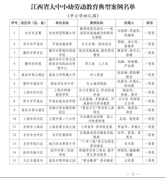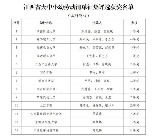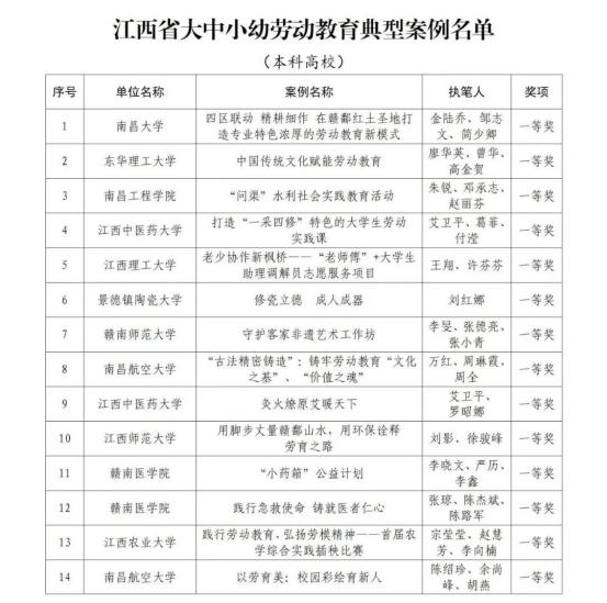 为加快推进我省大学、中学、小学和幼儿园劳动教育,省教育厅印发了《关于开展2022年全省大中小幼劳动教育典型案例和劳动清单征集评选活动的通知》(赣教体艺办函〔2022〕12号),决定在全省范围内评选一批省级劳动教育典型案例和优秀劳动清单。经各地各学校逐级申报、推荐,省教育厅组织专家评审并公示无异议后,确定南昌大学《四区联动 精耕细作 在赣鄱红土圣地打造专业特色浓厚的劳动教育新模式》等130个学校案例为江西省大中小幼劳动教育典型案例,江西财经大学等70个学校劳动清单为江西省大中小幼优秀劳动清单。现将获奖名单予以公布。