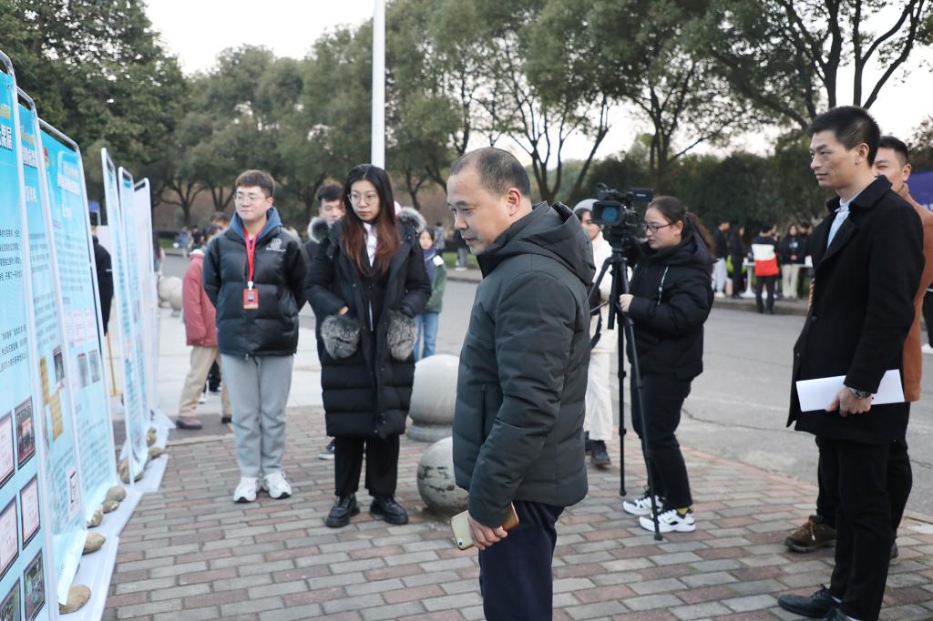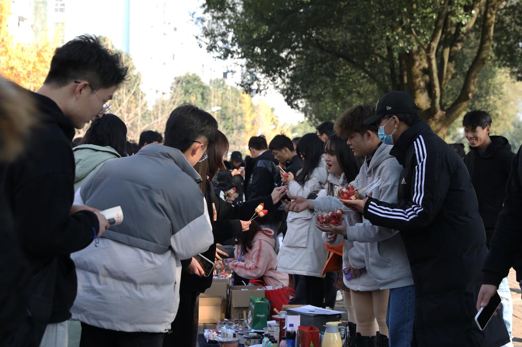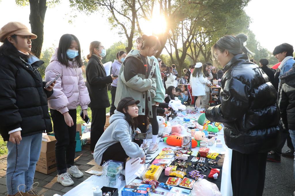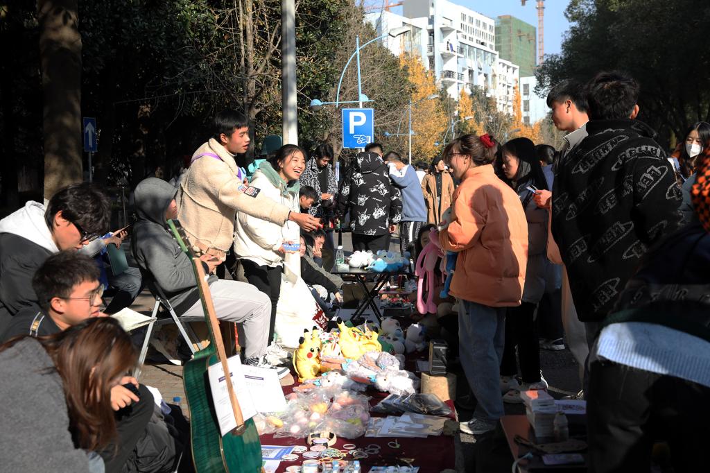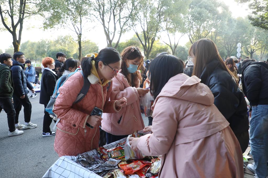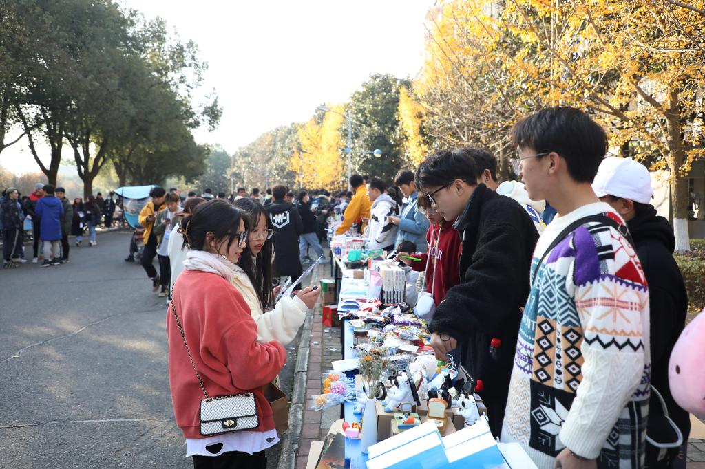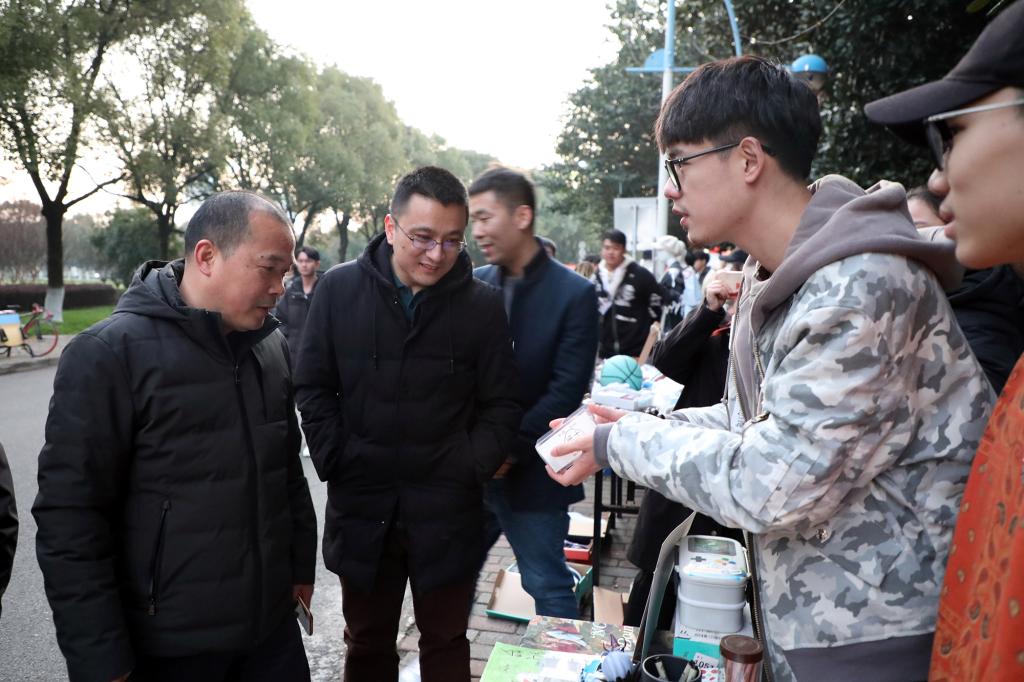 市集现场,商品交易区、成果展示区、项目体验区、互动区、公益区等五大区域人潮涌动、热闹非常。来来往往的“赶集”师生或低头观看,或抬头环顾,在各色创意类、特产类商品的“淘宝”中尽享“逛吃逛吃”和“买买买”的乐趣。当天,党委副书记、副校长闵桂林在校团委、各学院有关负责人的陪同下来到活动现场,和师生一同感受市集热闹,并与同学们亲切交流。