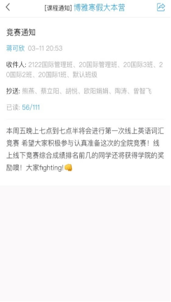 为了响应学校“寒假停课不停学”的号召,进一步督促学生弯道超车,帮助学生巩固课堂知识与提升自主学习能力,博雅国际学院寒假期间在超星学习通线上平台开设“博雅寒假大本营”课程,给学生布置寒假作业打卡和PET级别词汇背诵的任务,并在寒假期间全程指导学生完成雅思阅读、雅思听力、雅思口语和雅思写作打卡作业,并为学生答疑解惑,每周进行一次词汇线上测试。