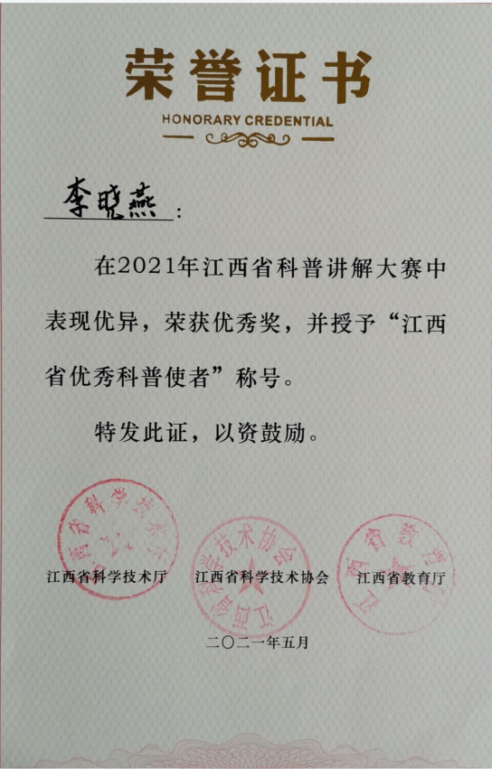 近日,由江西省科技厅、省科协、省教育厅主办的2021年江西省科普讲解大赛在江西省科学技术馆成功举行。我校医学院、信息工程学院、协同创新中心三个省级科普基地参加此次大赛并荣获优秀组织奖,参赛选手李晓燕同学荣获“江西省优秀科普使者”称号。