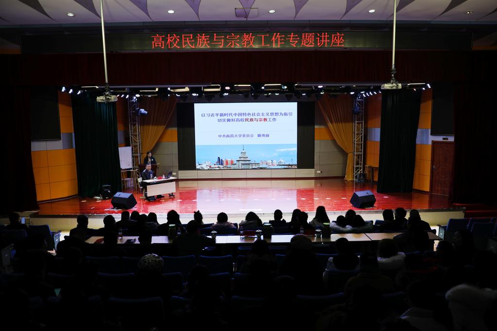为深入学习贯彻习近平新时代中国特色社会主义思想,加强民族宗教工作队伍建设,提升新形势下高校民族宗教工作的能力和水平,12月4日上午,我校邀请南昌大学党委常委、统战部部长滕勇前来校作了题为“以习近平新时代中国特色社会主义思想为指导 切实做好高校民族与宗教工作”的讲座。校党委副书记、副校长黄辉玲、闵桂林到场聆听。讲座由统战部部长刘瑛主持。