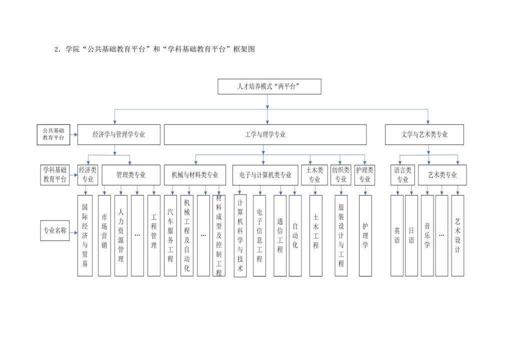 继续完善“两平台+N模块”人才培养模式,“两平台”即为公共基础教育平台和学科基础教育平台。根据人才通用能力的培养需要,构建公共基础教育平台,公共基础教育平台分为工学与理学类、经济与管理类、文学与艺术类三类。根据人才专业基础能力的培养需要,构建学科基础教育平台,学科基础教育平台分为机械与材料类、电子与计算机类、土木类、纺织类、护理类、管理类、经济类、文学类、艺术类等9类。“N模块”即为专业核心能力模块,各专业根据行业能力需求,构建与培养目标相适应的2-3个能力模块。公共基础教育平台、学科基础教育平台由学校统一管理,专业能力模块由各学院管理。公共基础教育平台、学科基础教育平台保持相对稳定,专业能力模块根据市场变化可进行动态调整。“两平台+N模块”人才培养模式框图如下: