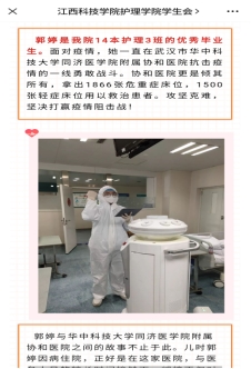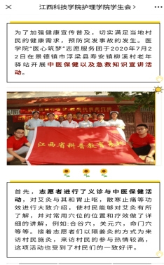 其次,通过红十字会、阳光天使服务团、中医养生社团等组织,在校级、省级志愿者平台的帮助下,组织学院学生深入高校、社区、家庭,坚持志愿服务科普活动,传递健康知识,为江西的“全民健康”奉献犬马之力。医学院也一直注重“劳动”精神的教育,不断促进活动的多样化、扩大专业特色与劳动育人相结合的活动的覆盖面等方式,促进、落实学生的劳动精神的培养,希望通过这些工作培养一批具备劳动能力与劳动精神的医学人才。