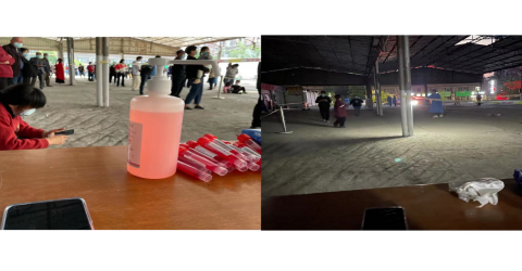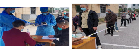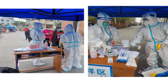跟我一起工作的大多是一些叔叔阿姨大伯们,他们也是第一次做这些事,在布置场地的时候,我会站在卫生角度给他们提一些防疫部署建议,监督他们使用正确的消毒方法等。第一天虽然缺乏实战经验,工作进行的稍微有一些混乱,但效率很高,我们也立马总结了经验改进了不足之处,现在的核酸工作进行的井然有序。